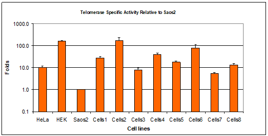 CBI offers a quantitative analysis of telomerase activity in cell lines and tissue samples using a proprietary qPCR assay with the optimized telomeric repeat amplification protocol.